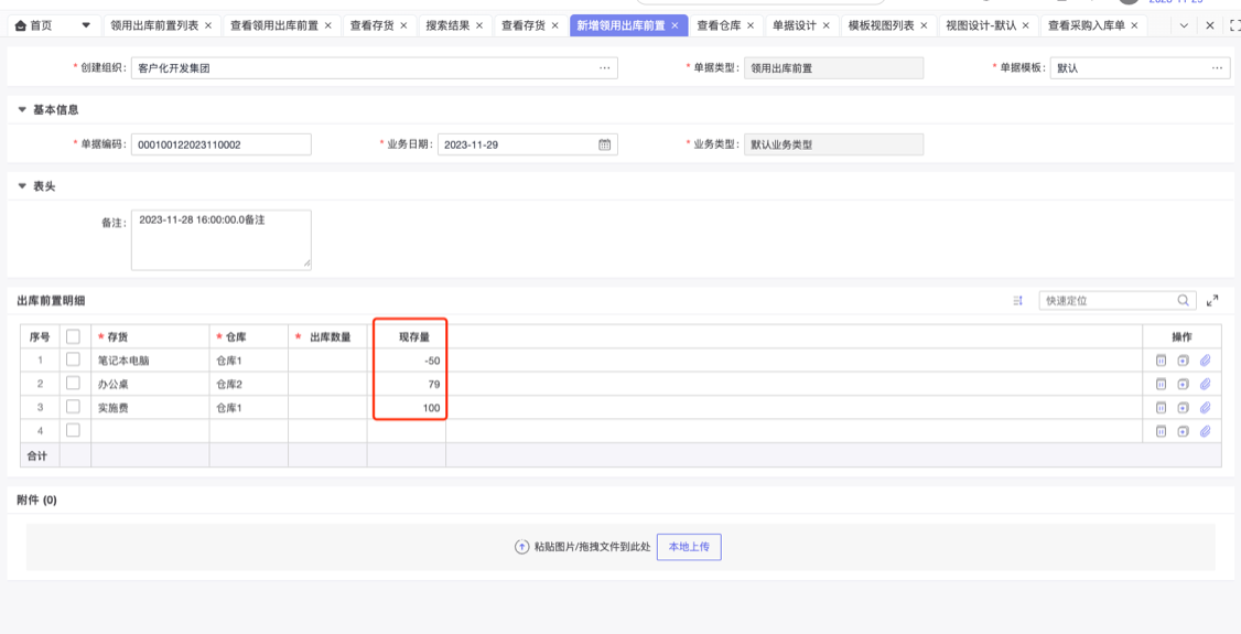步骤1、新增自定义单据,明细表选择存货,仓库,然后点击左下方的获取现存量按钮,即可触发前端脚本。