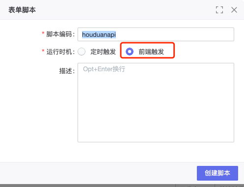 1、在企企系统智元平台上,公共后端平台-> 新建脚本houduanapi,并选择运行时机为前端出触发