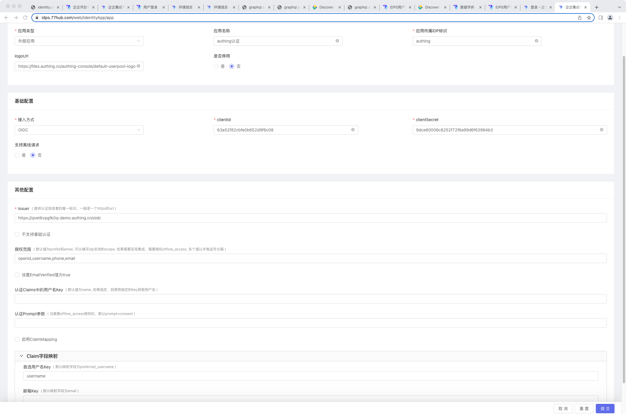 - 授权范围: 即scope信息, 默认为profile和emal,可以填写idp支持的scope, 如果需要实现集成,需要授权offline_access, 多个值以半角逗号分隔