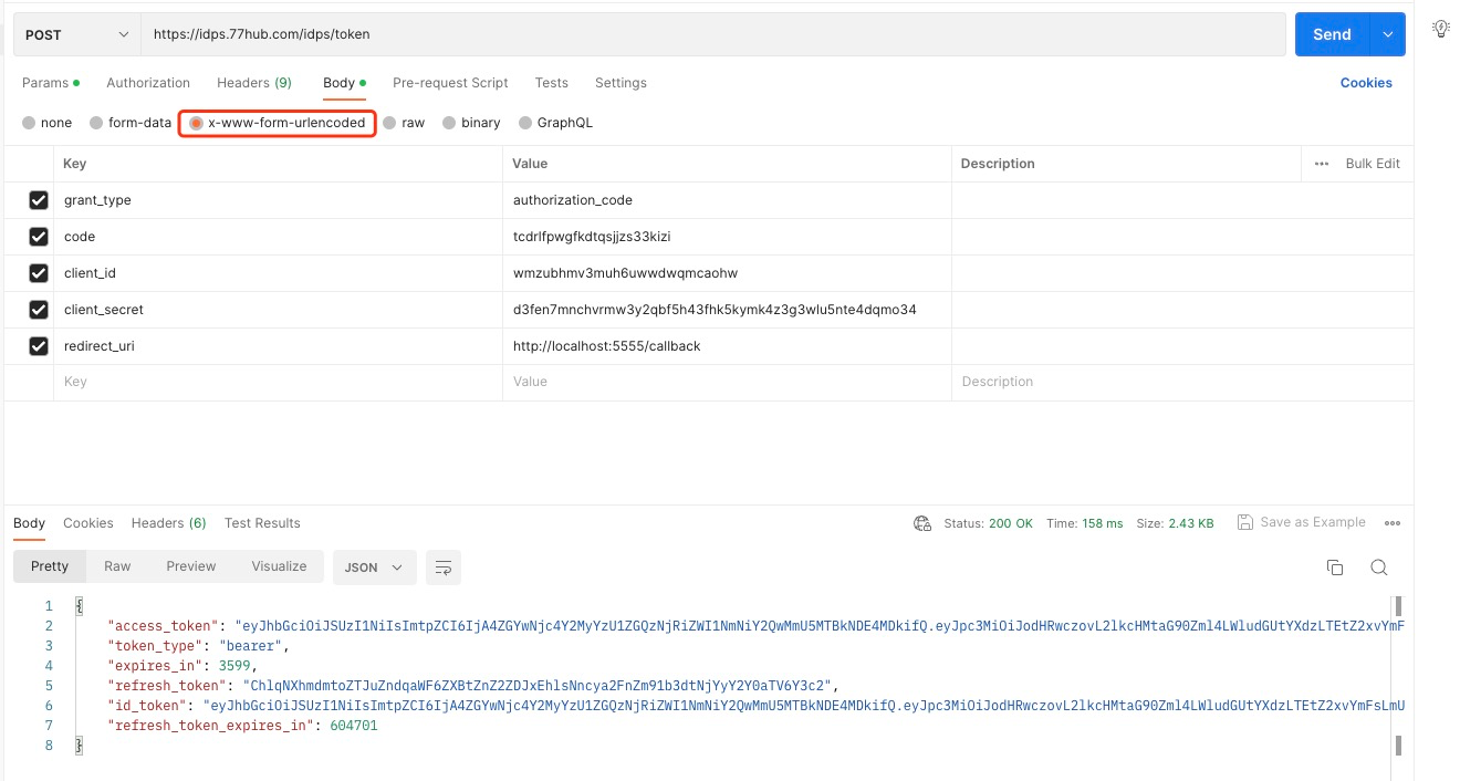 - https://idps.77hub.com/idps/token 接口postman请求示例如下: