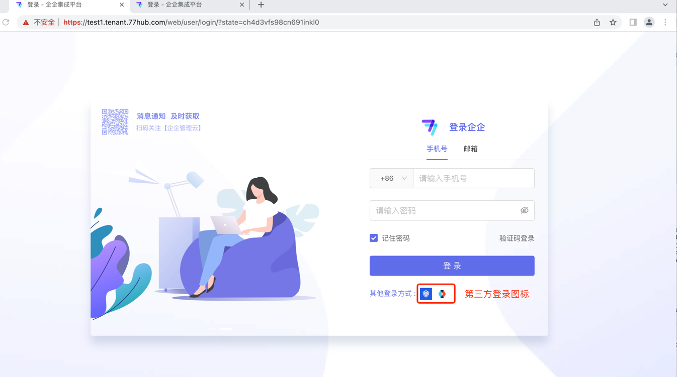 - 使用租户子域名,或者顶级域名, 例如: https://tenant-子域名.77hub.com/idps/auth